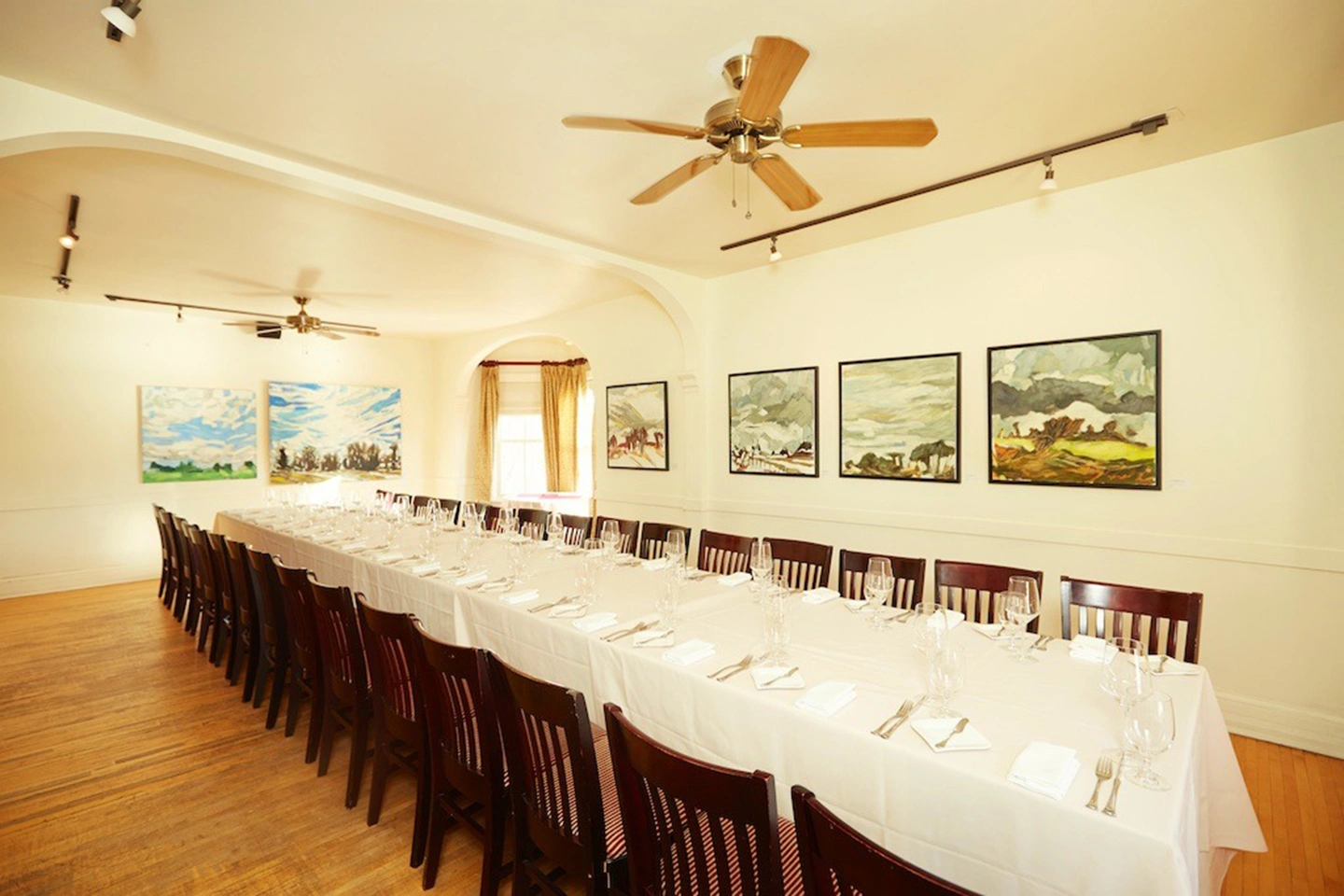 Located on the second floor this spacious room includes two large bay windows and is perfect for mid-sized events or weddings.